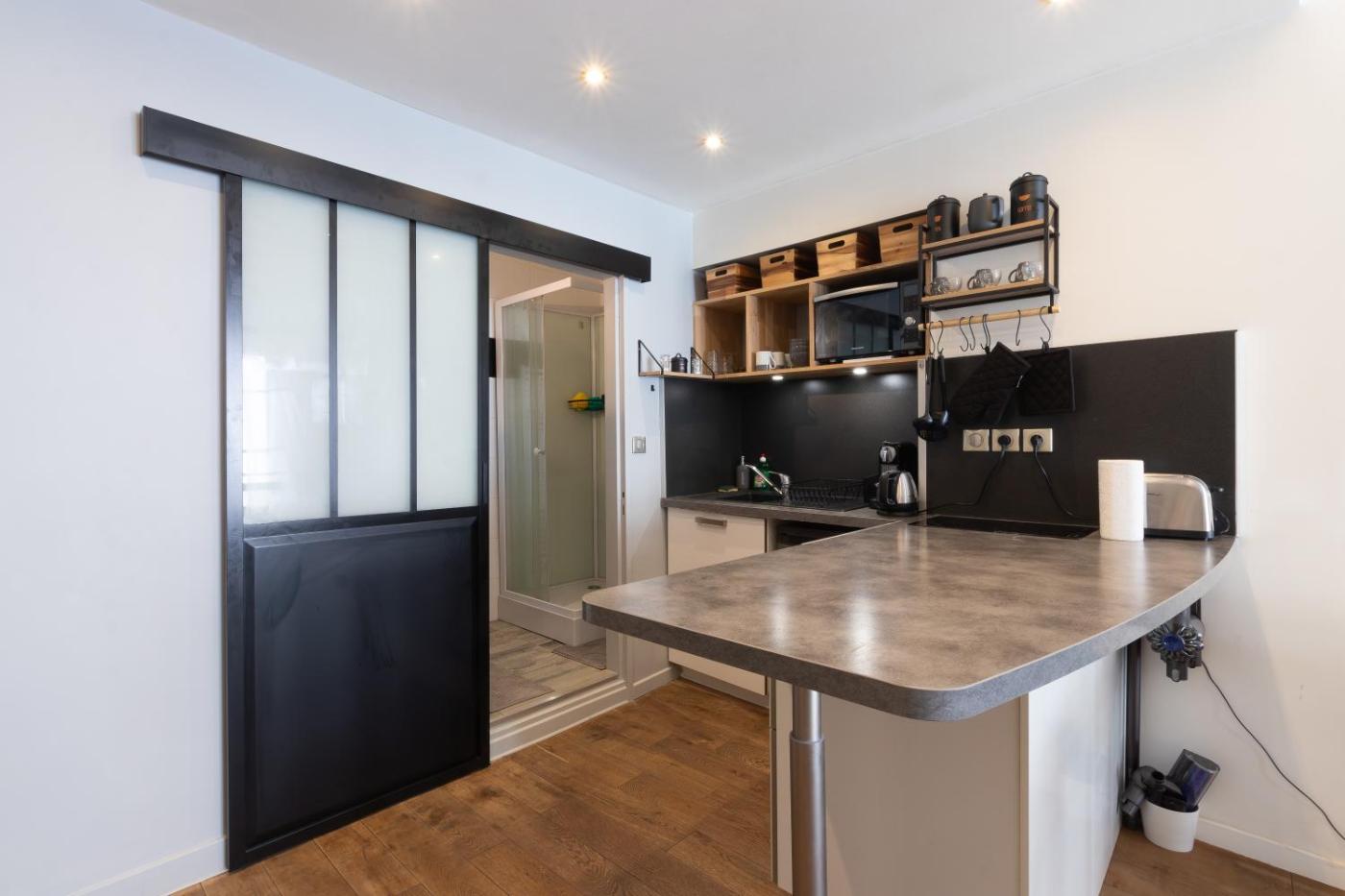 Appartement 1 Chambre. This apartment is comprised of 1 living room, 1 separate bedroom and 1 bathroom with a shower and a hairdryer. In the kitchen, guests will find a stovetop, a refrigerator, kitchenware and a microwave. The apartment offers a flat-screen TV, a washing machine, a tea and coffee maker, a wardrobe as well as city views. The unit offers 2 beds.
