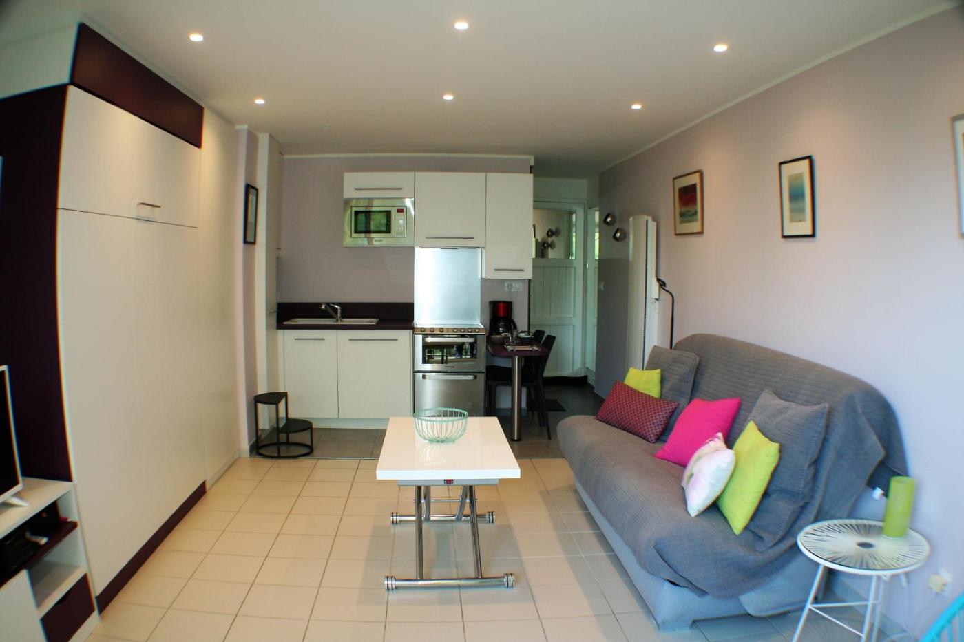 Studio - Vue sur Mer. In the well-equipped kitchen, guests will find a stovetop, a refrigerator, a dishwasher and kitchenware. The studio offers a washing machine, a private entrance, a balcony with sea views as well as a private bathroom boasting a walk-in shower. The unit has 1 bed.