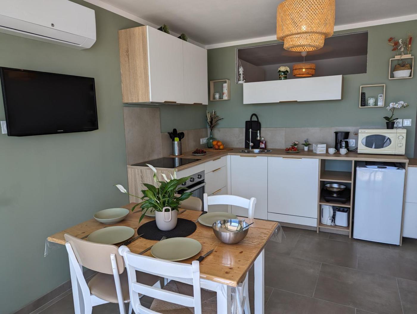 Studio - Vue sur Mer. The well-equipped kitchen features a stovetop, a refrigerator, a dishwasher and kitchenware. The air-conditioned apartment offers a TV, a washing machine, a private entrance, a tea and coffee maker as well as sea views. The unit offers 2 beds.