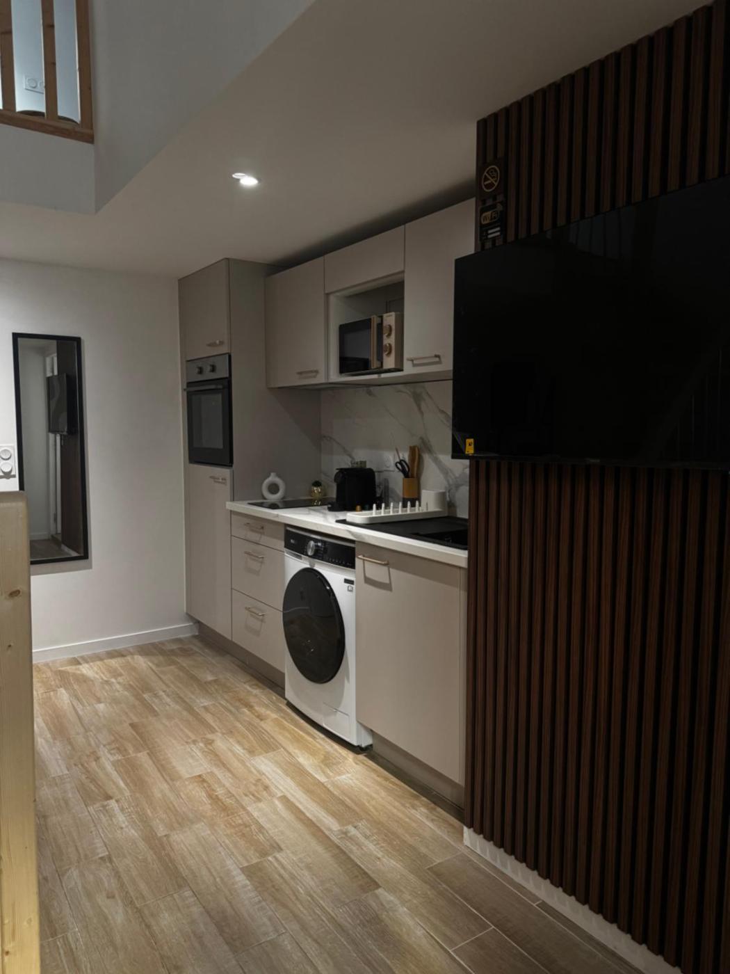 Appartement 1 Chambre. The well-equipped kitchen features a stovetop, a refrigerator, kitchenware and an oven. This apartment is air-conditioned and has a flat-screen TV with streaming services, a washing machine, soundproof walls and a coffee machine. The unit has 2 beds.