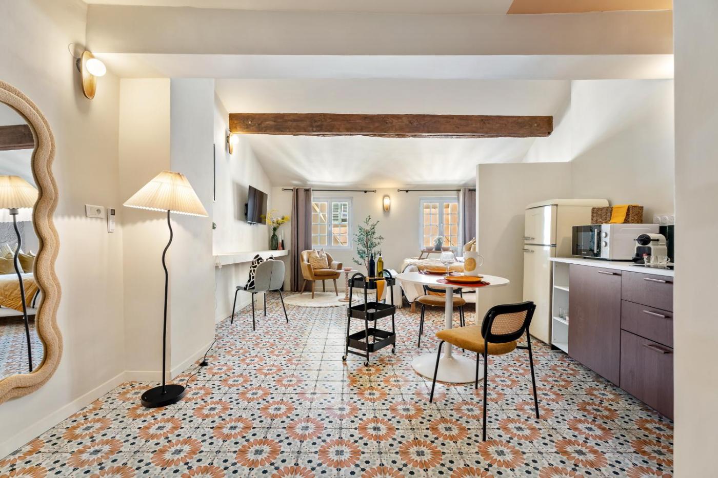 Appartement 1 Chambre. The air-conditioned apartment has 1 bedroom and 1 bathroom with a shower and a hairdryer. The well-fitted kitchen features a stovetop, a refrigerator, a microwave and a toaster. The apartment features a flat-screen TV with streaming services, a washing machine, soundproof walls, a tea and coffee maker as well as city views. The unit has 1 bed.
