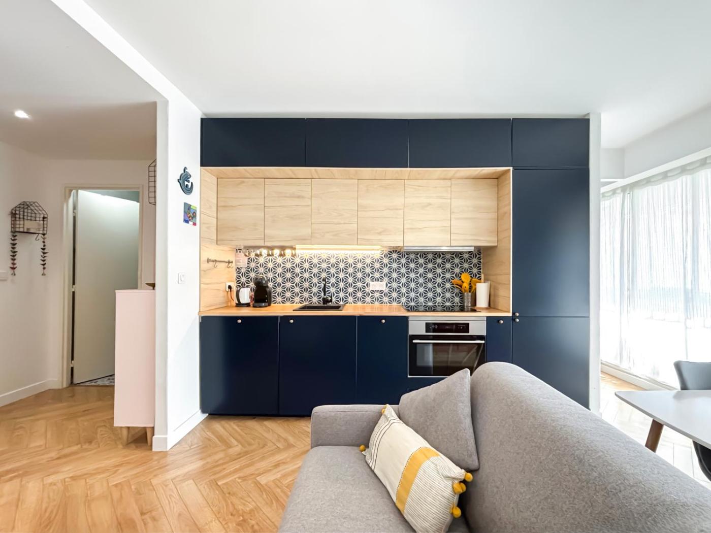 Appartement 1 Chambre. This apartment includes 1 living room, 1 separate bedroom and 1 bathroom with a bath and a hairdryer. The fully equipped kitchen features a refrigerator, a dishwasher and a microwave. This apartment has a washing machine, a coffee machine, a flat-screen TV and a balcony. The unit has 2 beds.