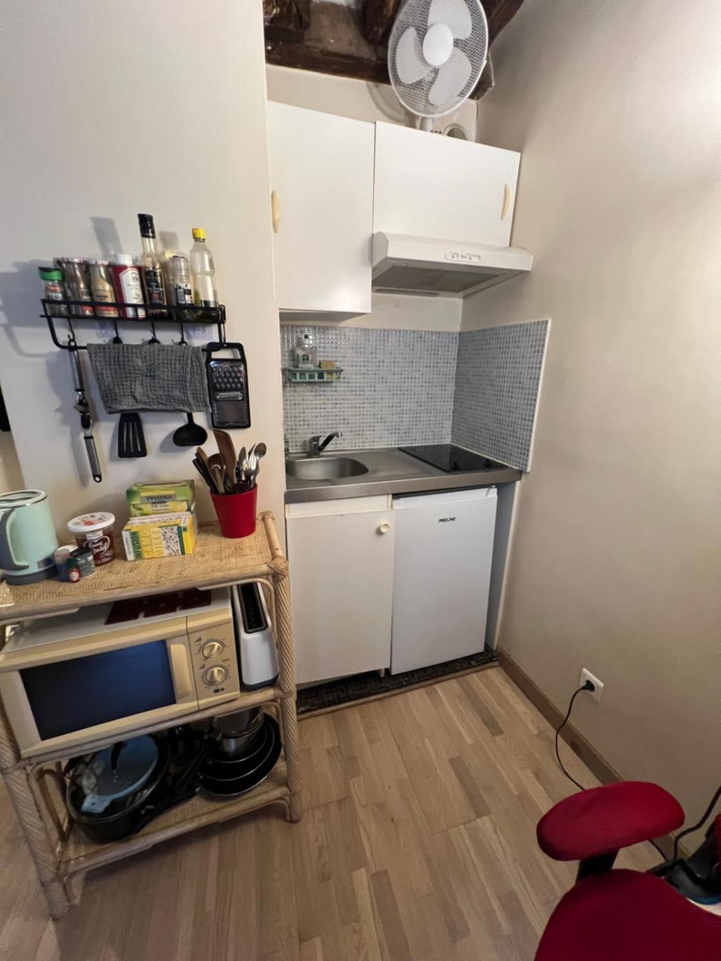 Appartement 1 Chambre. The fully equipped kitchenette has a stovetop, a refrigerator, kitchenware and a microwave. The apartment features parquet floors and features a tea and coffee maker, a wardrobe and a quiet street view. The unit has 1 bed.