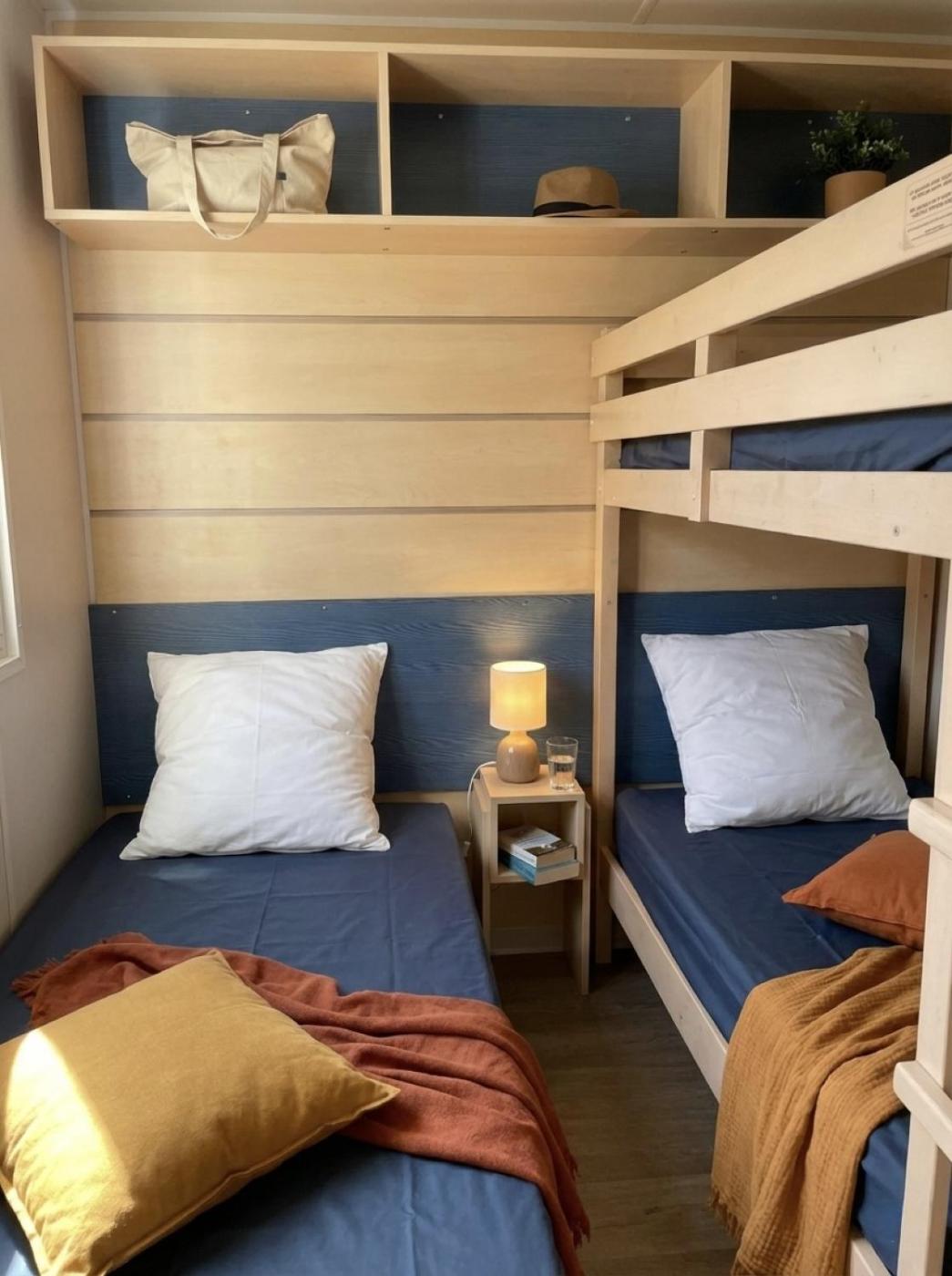 Mobile Home. This air-conditioned mobile home comprises 1 living room, 2 separate bedrooms and 1 bathroom with a shower. Guests will find a stovetop, a refrigerator, kitchenware and a microwave in the kitchenette. The mobile home also provides guests with a barbecue. This mobile home features a washing machine, a coffee machine, a TV and a terrace. The unit offers 4 beds.